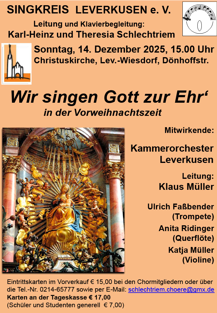 Unter dem Titel WIR SINGEN GOTT ZUR EHR‘ wird ein bunter Melodienstrauß aus einerseits geistlichen und festlichen, andererseits zu Herzen gehenden Gesängen erklingen, u.a. weihnachtliche Kompositionen des bekannten englischen Komponisten John Rutter und Liedsätze aus der Feder der beiden Chorleiter des Singkreises Leverkusen zu bekannten Weihnachtsliedern. Die Liedvorträge werden teilweise begleitet vom Kammerorchester Leverkusen. Unter Leitung von Klaus Müller spielt das Orchester zudem Kompositionen von Mozart und Vivaldi mit den Solistinnen Anita Ridinger (Querflöte) und Katja Müller (Violine). In der Hymne „Singt dem Herrn der Welt“ wird Ulrich Faßbender seine Trompete erstrahlen lassen.